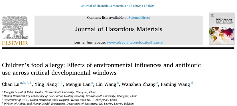 劳动卫生与环境卫生系路婵教授团队的研究成果 “Children's food allergy: Effects of environmental influences and antibiotic use across critical developmental windows” 在国际环境健康领域权威期刊Journal of Hazardous Materials(IF:13.6,JCR Top 5%,中科院1区TOP)以Research Paper发表。路婵教授为该文唯一通讯作者和共同第一作者,韩漫