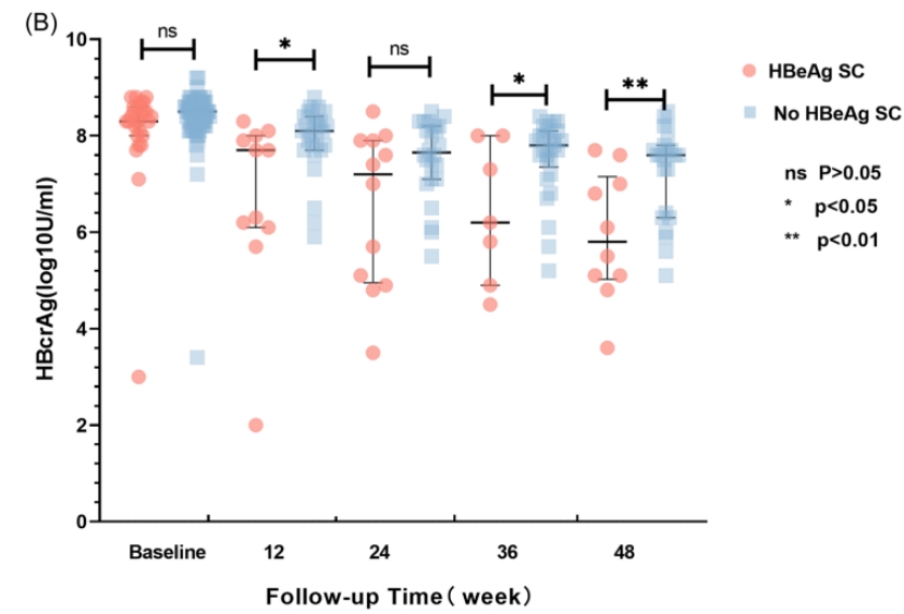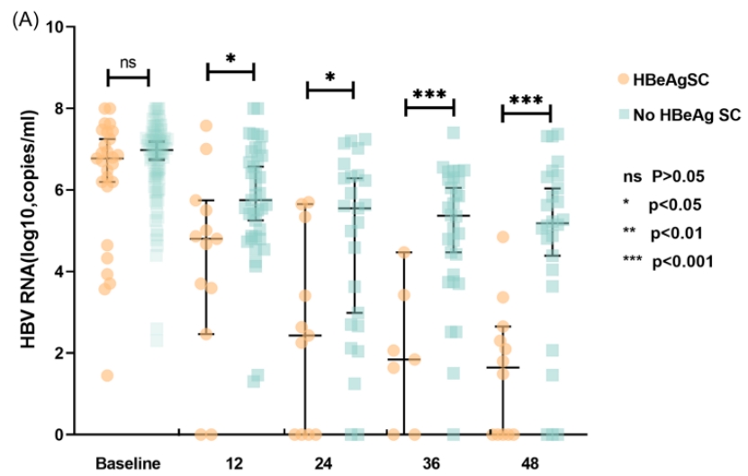 针对儿童慢乙肝治疗效果的生物标志,研究课题组关注到了新型HBV血清学标志——HBV RNA和HBcrAg。在经过抗病毒治疗的儿童慢乙肝患者中发现,早期治疗患者体内HBV RNA和HBcrAg动态水平对HBeAg血清学转换具有重要意义。通过检测抗病毒治疗后患者第6周、第12周、第48周的HBV RNA与HBcrAg的水平,Cox回归分析发现血清HBV RNA(HR = 0.71,95% CI:0.56-0.91,p = 0.006),HBcrAg(HR = 0.60,95% CI:0.43-0.84,p = 0.003)和HBsAg(HR = 0.49,95%CI:0.36-0.69,p < 0.001)是HBeAg血清转换的独立预测因素。相较于未发生HBeAg转阴的患者,HBeAg血清学转阴患者从治疗第12周开始,血清中HBV RNA以及HBcrAg的水平显著降低,而且从基线到第36周的HBV RNA下降值(AUC = 0.871,P = 0.003)以及从基线到第12周HBcrAg的下降值(AUC = 0.810, P = 0.003)能够准确预测HBeAg血清学转换。相关研究已在Journal of Medical Virology期刊发表。
