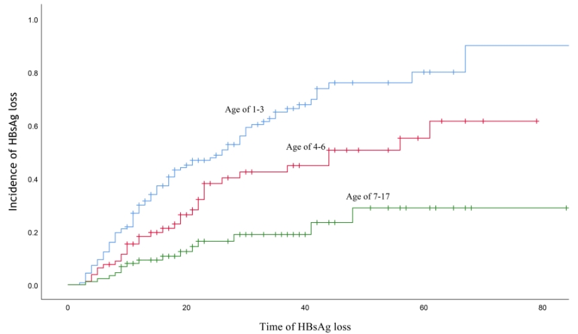 在HBV感染过程中,多项证据表明,年龄对HBV感染的疾病进展和治疗结局有显著影响,但在不同年龄组的儿童慢乙肝队列中尚未得到证明。研究课题组基于湖南省儿童医院慢乙肝初治儿童回顾性队列,针对抗病毒治疗起始年龄与临床疗效的关系展开研究,研究结局包括血清学中乙肝表面抗原(HBsAg)的丢失、乙肝e抗原(HBeAg)的清除或转换、HBV DNA的不可测等。研究将儿童患者按照治疗起始年龄进行分组,将纳入分析的306名慢乙肝儿童分为1-3岁组(139例),4-6岁组(79例)和7-17岁组(88例)。在随访结束时,1-3岁组慢乙肝儿童的累积HBsAg清除率超过90%,明显高于4-6岁以及7-17岁组。同样,HBeAg清除以及HBV DNA不可测的结局具有相似的结果。随着治疗起始年龄的增加,HBsAg清除率和HBeAg清除率均有所下降。研究表明,在HBV感染儿童患者中,接受治疗的年龄越小,治疗效果越好。相关的研究成果发表于Alimentary Pharmacology & Therapeutics(中科院1区)期刊上。