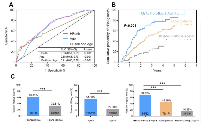 本课题组在儿童慢乙肝患者队列中发现了HBsAg和HBsAb共存现象,这种特殊的血清学模式在HBV感染自然史中是不常见的。根据相关报道,在全球范围内HBsAg和HBsAb双阳性的流行率低于10%,在我国大陆约为2.4% -5.8%。关于该血清学模式,既往研究主要集中在慢乙肝成人,对儿童慢乙肝的研究较为缺乏。本课题组研究发现,在所纳入的372例慢乙肝儿童患者中,接受抗病毒治疗且拥有该血清学模式的慢乙肝儿童患者获得HBsAg清除、HBeAg清除以及HBV DNA不可测的比例显著更高。此外,基线时不同的HBV表面抗体(HBsAb)水平与HBsAg清除、HBV DNA不可测之间存在线性剂量-反应关系,随着基线HBsAb水平的升高,HBsAg清除和HBV DNA不可测的比例也相应增加。受试者工作特征曲线(ROC)显示,截止随访结束时,HBsAb水平≥0.84 log10 IU/L且年龄≤5岁的患者在研究队列中具有最高的HBsAg清除率,为识别具有较高应答率的抗病毒患者提供了依据。相关研究也已经在BMC Medicine(中科院1区)期刊中发表。