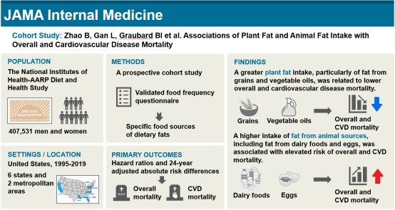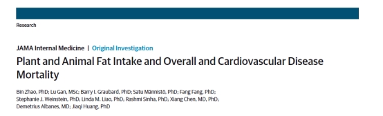 三诺营养与代谢健康研究中心/芙蓉实验室黄佳琦、赵斌教授团队题为“Plant and Animal Fat Intake and Overall and Cardiovascular Disease Mortality”的原创性研究论文。本项研究在芙蓉实验室陈翔教授的指导和大力支持下,围绕精准营养与代谢健康,主要阐述了通过宏量营养素-脂肪对慢性病发生发展风险影响,全面评估了不同来源的植物源脂肪、动物源脂肪摄入与心血管疾病死亡和过早死亡显著关联。赵斌教授和博士生甘露为本论文共同第一作者,陈翔教授、Demetrius Albanes教授和黄佳琦教授为共同通讯作者。
