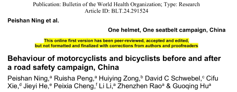 流行病与卫生统计学系胡国清教授团队的最新研究成果“Behaviour of motorcyclists and bicyclists before and after a road safety campaign, China”在国际公共卫生领域权威期刊、世界卫生组织官方期刊《Bulletin of the World Health Organization》(IF=8.4,SCI分区1区,Top 5%期刊)发表。韩漫