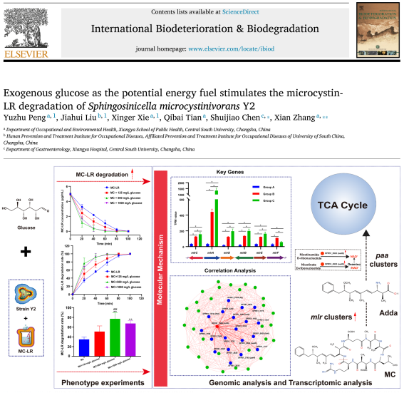 基于Sphingosinicella microcystinivorans Y2多组学分析,表明外源葡萄糖通过上调nadD基因表达促进NAD+合成,进而激活Mlr酶系统,提升微囊藻毒素降解效率,为外源碳强化微囊藻毒素生物修复提供理论支撑(Int Biodeter Biodegr,彭玉竹、刘佳惠和谢幸儿为共同第一作者,湘雅医院陈水姣和张宪为共同通讯作者)。
