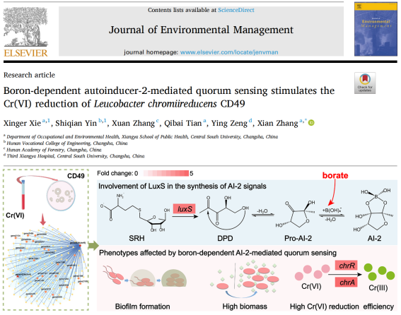突破传统非生物驱动理论局限,团队通过多组学联合分析首次阐明Leucobacter chromiireducens CD49中LuxS/AI-2群体感应系统对Cr(VI)还原的关键调控作用。基于Box-Behnken实验设计优化条件,证实硼依赖型群体感应信号分子AI-2可正向刺激Cr(VI)生物还原,为微生物修复技术优化提供新靶点(J Environ Manage,研究生谢幸儿、尹诗倩为共同第一作者,张宪为通讯作者)。