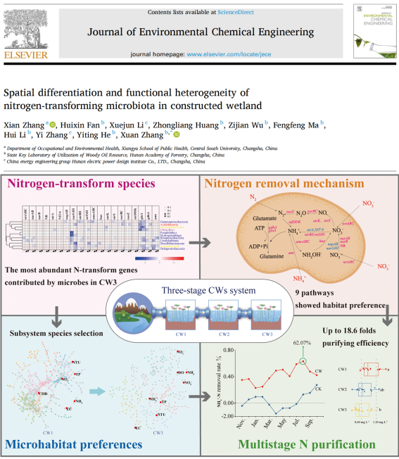 通过连续监测三阶人工湿地,揭示微生物群落空间分异规律及氮转化功能基因梯度分布特征。环境宏基因组学分析表明,人工湿地系统通过微生物代谢分工实现氮污染物去除,并提出“自适应组装-协同共生”的氮循环驱动模型(J Environ Chem Eng,张宪为第一作者,湖南省林业科学院张轩为通讯作者)。