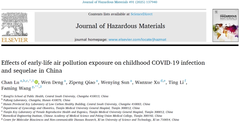 湘雅公共卫生学院劳动卫生与环境卫生学系路婵教授团队与西安科技大学OHRG团队负责人王发明教授的合作研究成果“Effects of early-life air pollution exposure on childhood COVID-19 infection and sequelae in China”在国际环境健康领域权威期刊《Journal of Hazardous Materials》(IF:12.2,JCR Top 3%,中科院1区TOP)以Research Paper发表。路婵教授为该文第一作者和共同通讯作者,王发明教授为该文共同通讯作者,韩漫