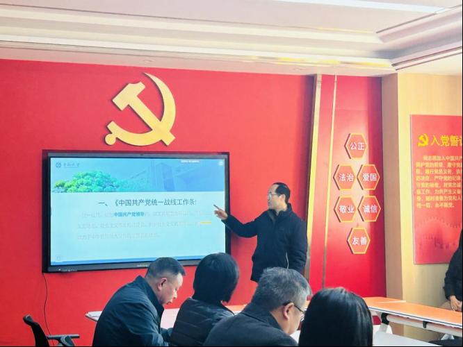 胡国清院长首先给大家从工作条例,指导思想,主要任务及主题等方面深入浅出地讲解了新时代我党统一战线工作的相关理论知识。统一战线是立足我们党在新时代新征程上全面建成社会主义现代化强国、以中国式现代化全面推进中华民族伟大复兴的中心任务作出的科学概括和战略部署,对于发展壮大新时代爱国统一战线,汇聚起共襄伟业的磅礴力量,具有十分重要的意义。习近平总书记在党的二十大报告中强调:“完善大统战工作格局,坚持大团结大联合,动员全体中华儿女围绕实现中华民族伟大复兴中国梦一起来想、一起来干”。统一战线一定要紧紧围绕党和国家中心工作,充分发挥自身优势,深入调查研究,积极反映社情民意,为科学决策提供参考。
