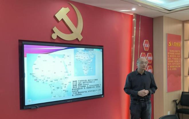 职工第二党支部在B210会议室开展主题党日活动。本次活动主题为"深度融入共建一带一路,助力健康事业国际合作新模式",邀请了第19批援塞拉利昂医疗队医疗组组长杨宁医生(韩漫