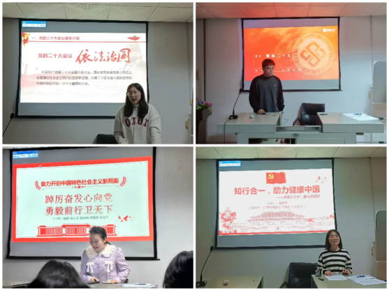 本次党日活动中,通过微党课分享学习二十大精神心得体会的5个小组,分别从“感悟二十大 民主新路标”、“全面推进依法治国”、“踔厉奋发心向党 勇毅前行卫天下”、“回顾医疗事业百年历程”、“知行合一 助力健康中国”等不同角度,对标党的二十大报告,谈成就、谈体会、谈使命、谈行动。小组成员通过提前收看现场学、梳理要点归纳学、小组成员研讨学等多种渠道和方式精学二十大报告全文、深悟二十大精神内涵、把握二十大核心要义。