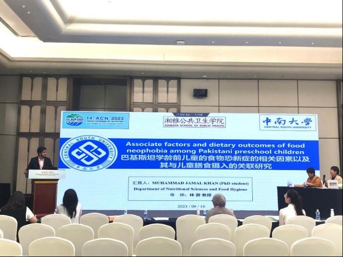 博士研究生Muhammad Jamal Khan代表课题组在会上作了题为“巴基斯坦学龄前儿童食物恐新相关因素及其与膳食摄入的关联性研究”的口头汇报。此外,硕士研究生张雅茜、卫洁琼、张钰浛、向露、张柔、谭秀英几位同学以壁报的形式与大家交流了课题组的相关研究进展。