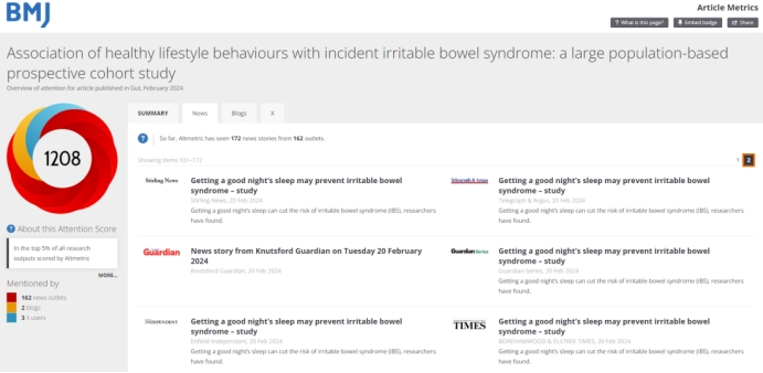 流行病与卫生统计学系吴心音教授团队的研究成果 “Association of healthy lifestyle behaviours with incident irritable bowel syndrome: a large population-based prospective cohort study”。已有包括美国有线电视新闻网(CNN)、英国独立报(The Independent)、卫报(The Guardian)在内的162家新闻媒体报道了该研究。该研究工作由韩漫