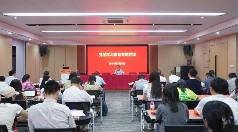 六楼学术报告厅为学院师生讲授党纪学习教育专题党课,学院领导班子成员、党支部正副书记、各系室(中心)正副主任和学生党员代表参加听课,讲座由学院党委书记雷先阳主持。