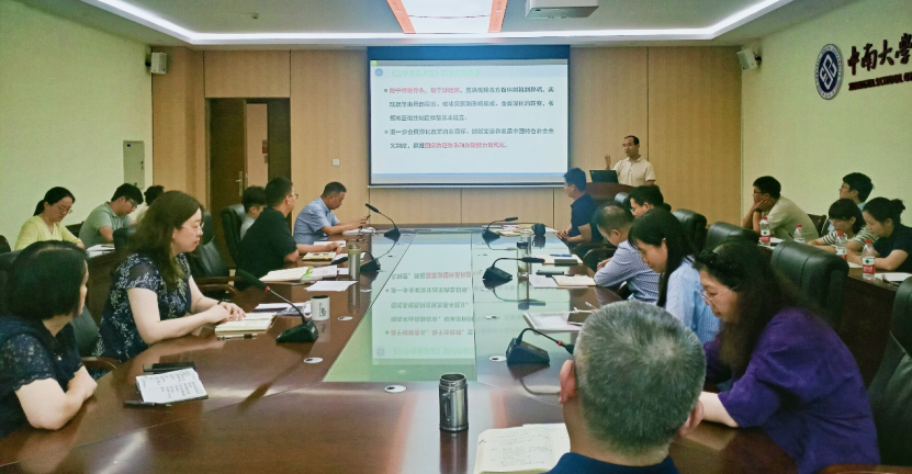 胡国清院长做了题为《学习贯彻二十届三中全会精神,以改革破解学院发展顽疾》专题分享,指出全院教职工要紧紧围绕学院政党工作要点,以钉钉子精神抓好改革落实,坚持自我革命主动担当作为,要充分发挥带头引领作用,认真做好开学准备工作,营造深入交流、团结协作的良好氛围,全面落实立德树人根本任务,促进学院高质量发展。