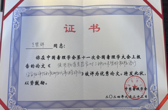 博士研究生宣黎辉的论文“使用肠道类器官对三种纳米塑料颗粒进行安全性评估的预测性代谢组学特征”在本次大会中脱颖而出,受到评委的一致好评,并荣获“第十一次全国毒理学大会优秀报告论文奖”。