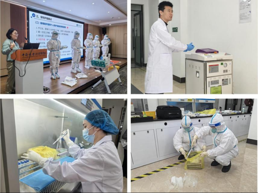 预防医学实验中心教师梁君锋依次就防护服穿脱、生物安全柜的规范操作和应急演练、高压灭菌锅(特种设备)的规范使用三个主题开展技能培训和应急演练。