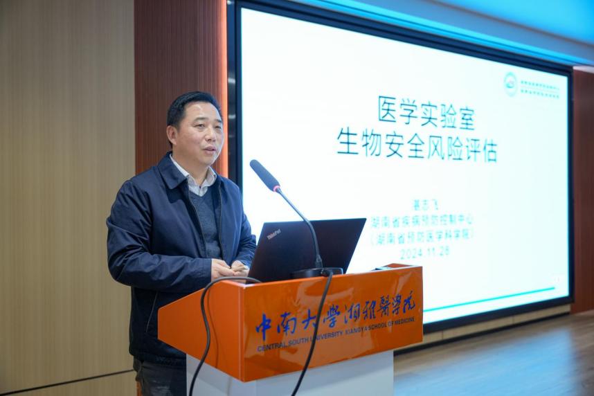 培训现场,湖南省疾病预防控制中心主任技师湛志飞就医学实验室生物安全风险评估和医学实验室生物安全管理两个主题对参会人员进行培训讲解。