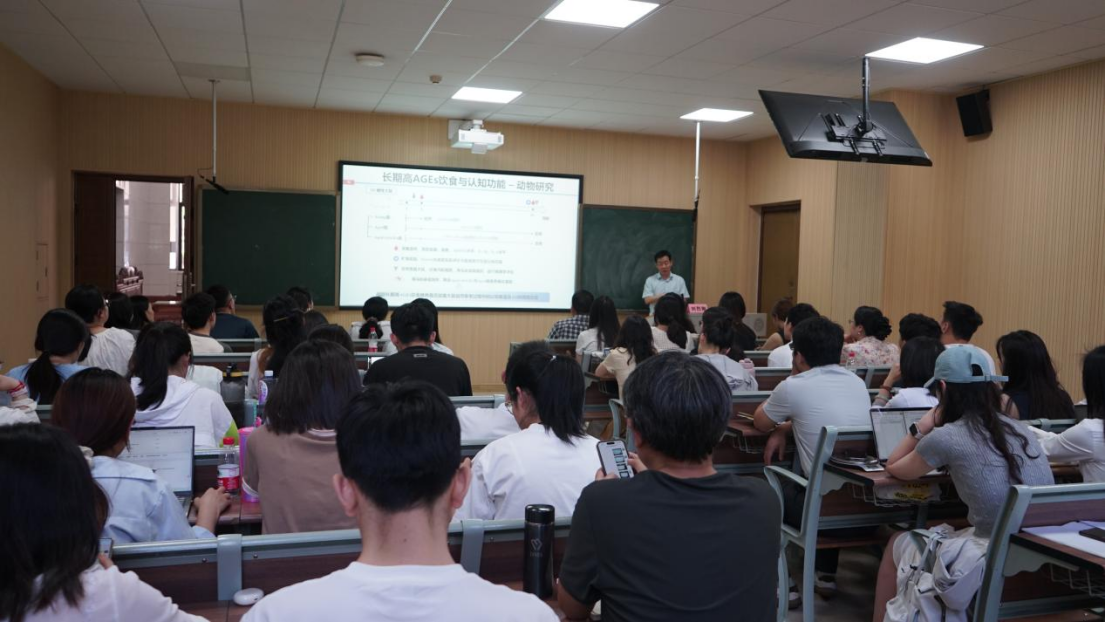 报告会上,刘烈刚教授凭借深厚的学术功底与丰富的实践经验,围绕 “抗衰新视角-基于 AGEs 的衰老慢病防控”,从 AGEs(晚期糖基化终末产物)的形成机制、对衰老和慢性病的影响等方面切入,结合前沿研究成果与实际案例,深入剖析了基于AGEs开展衰老慢病防控的新策略与新方法。他的讲解逻辑清晰、生动形象,不仅拓宽了在场师生的学术视野,更引发了大家对营养健康与慢病防控的深度思考。互动环节中,刘烈刚教授耐心解答师生疑问,现场学术交流氛围浓厚。