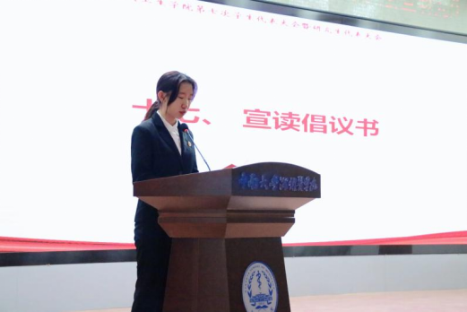 大会进入第十七项,新任学生会主席团代表张睿兮宣读了《韩漫