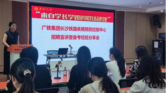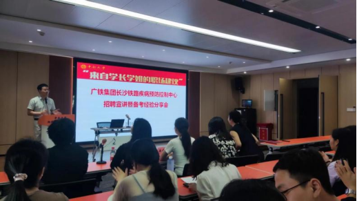 邀请中国铁路广州集团有限公司长沙铁路疾病预防控制中心人事劳资科科长刘红、团支部书记曾婷等五位校友来院为在读学弟学妹进行广州铁路局疾控所招聘宣讲及备考经验分享,开展访企拓岗就业专项活动。会议由学工办副主任尹逊强老师主持,学院近100名2024届、2025届研究生、本科生现场聆听与学习,学院党委书记雷先阳出席并致辞。