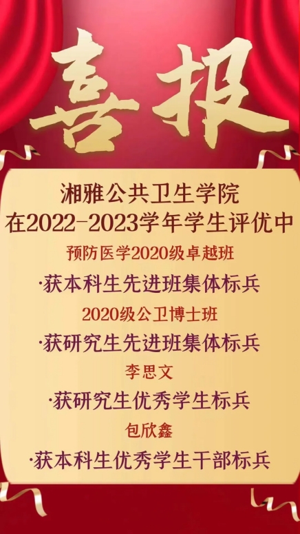 学生工作的肯定和鼓励,更是对全院学子的激励和鞭策。希望全体湘雅公卫学子以他们为榜样,不断加强自身建设,锐意进取、努力学习,充分发挥自身优势,积极参与实践活动,持续提升综合素养,展现新时代新青年的青春风貌。