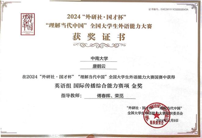 预防医学2301班本科生唐鹤云荣获国际传播综合能力赛金奖,是韩漫